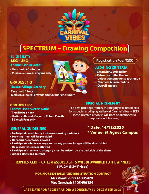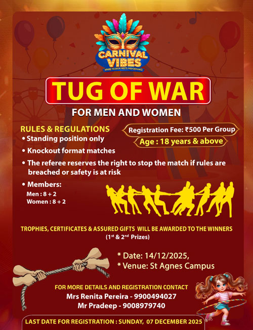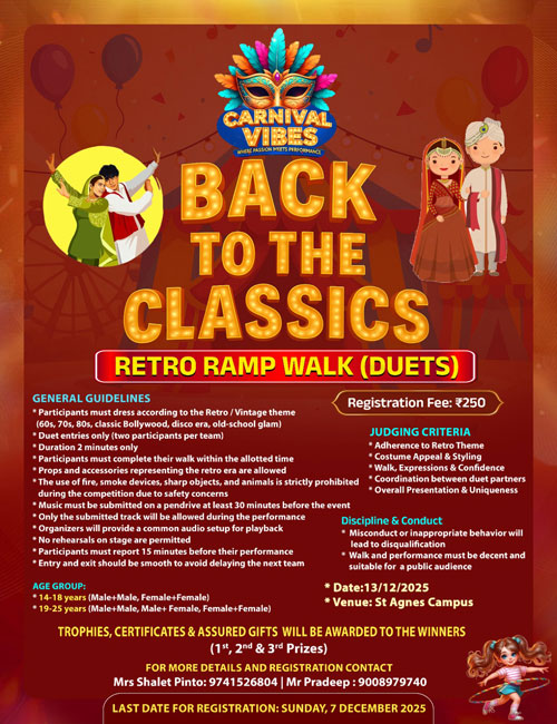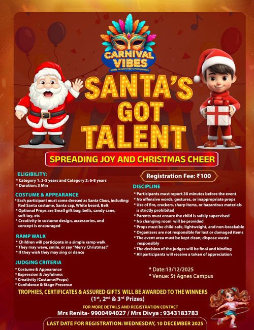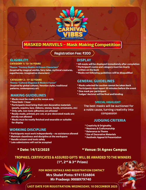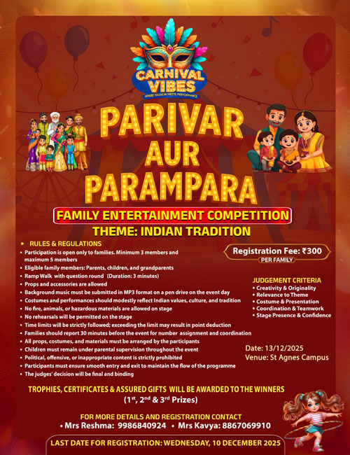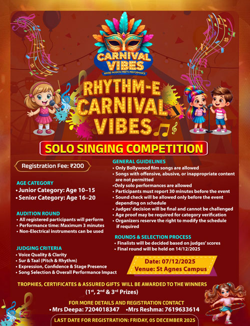 The Parent Teachers Association of St Agnes School, Mangalore has organized Carnival Vibes 2025, a vibrant two-day celebration scheduled on December 13 and 14 at St Agnes campus. The event promises a spectacular blend of entertainment, creativity, and community spirit, bringing together families, students, and the attendees for an unforgettable festive experience.